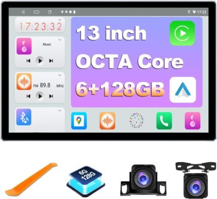 6+128GB 13 inch Double Din Touch Screen Android Car Stereo with Front and Rear Camera Octa Core Android 13 QLED Bluetooth GPS Radio DSP AM FM RDS SWC WiFi MIC