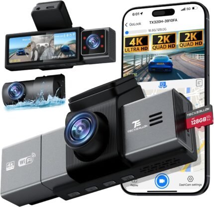 Dash Cam, 4K 3 Channel Dash Camera for Cars with App Control, 170°/150°/140° Wide Angle, ADAS Assist, No-Light Night Vision, GPS, G-Sensor, WDR, 24H Parking Monitor, 128GB SD Card Included