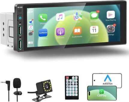 6.9″ Single DIN Car Radio with Apple CarPlay & Android Auto, IPS Touch Screen Car Stereo with 1080P Backup Camera, Bluetooth Hands-Free, Mirror Link, GPS Navigation, AM/FM, EQ, USB,Type-C,SWC