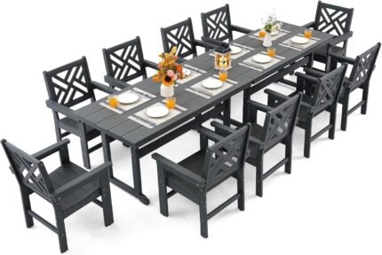 12 Piece HDPE Outdoor Dining Set for 10, Patio Dining Furniture Set with 2 Table and Umbrella Hole, Outdoor Table and Chairs for Garden, Poolside, Backyard, Deck