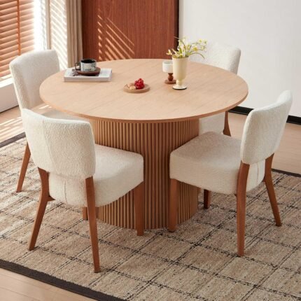 47 Inch Round Dining Table Set for 4, Modern Mid Century Circle Kitchen Dinner Wood Table with 4 Upholstered Stackable Dining Room Chairs for Living Room Apartment, Oak & White