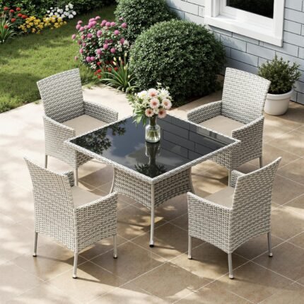5-Piece Patio Dining Set, Patio Furniture Set with Square Tempered Glass Table & 4 Wicker Chairs, Expandable Design for Larger Groups, Outdoor Furniture for Backyard, Deck, Garden, Beige