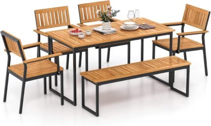 Tangkula 6 Pieces Outdoor Acacia Wood Dining Set, Patio Table and Chairs Set with Bench for 6-7 People, Outdoor Dining Furniture Set with 2″ Umbrella Hole for Garden, Backyard and Poolside