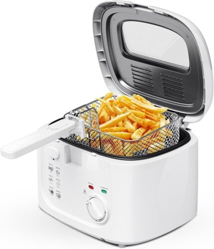 1500W Electric Deep Fryer with Adjustable Temperature Control, 2.5L Non-Stick Basket & Viewing Window, Folding Handle and Locking Cover for Easy Storage, White