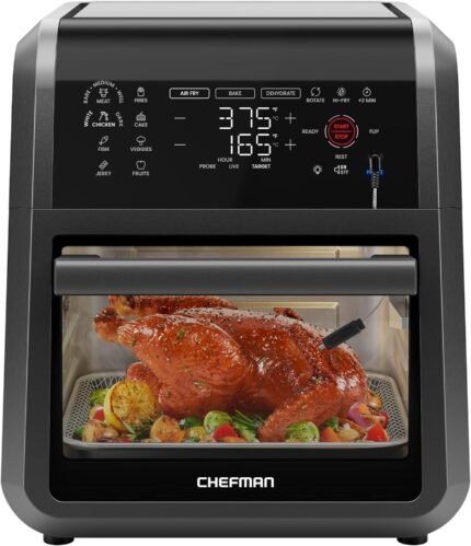 CHEFMAN ExacTemp™ 12 Quart 5-in-1 Air Fryer with Integrated Smart Cooking Thermometer, 28 Touchscreen Presets, Rotisserie, Dehydrator, Bake, XL Convection Oven with Auto Shutoff, Black