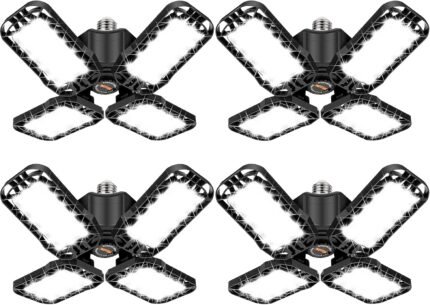 LED Garage Light 4 Pack, 120W Ultra Bright LED Shop Light with 4 Adjustable Panels, 12000LM E26/E27 Base Deformable Ceiling Fixtures for Garage, Workshop, Attic, Basement, Barn (Black-4 Pack)