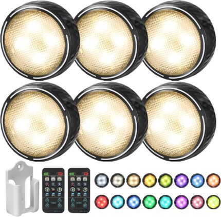 LED Puck Lights with Remote Battery Operated Under Cabinet Lighting Wireless Stick on Lights Color Changing Timer Tap Lights for Cabinets Shelves Closets Display Case – 6Pack Black