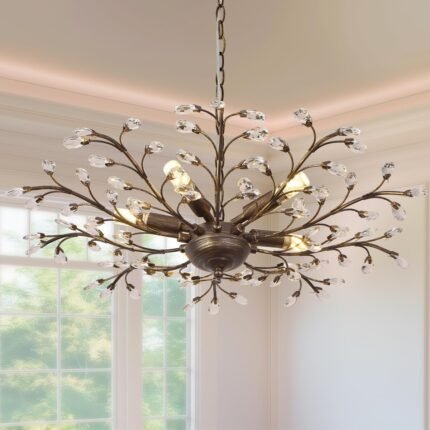 Vintage Crystal Chandelier with Aged Bronze Branch Design, 8-Light Ceiling Hanging Light Fixture for Dining Room Living Room Bedroom Hallway, Chain Adjustable