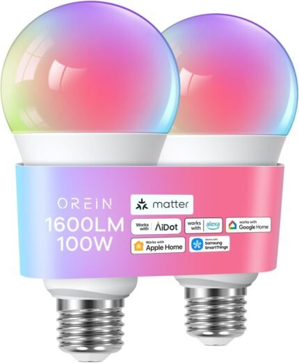 OREiN Matter Smart Light Bulb, 1600 Lumens 100W Equivalent Smart Light Bulbs, Color Changing Light Bulbs Work with Apple Home, Alexa, Google Home, SmartThings, A21 Smart Bulbs 2.4Ghz WiFi, 2Pack