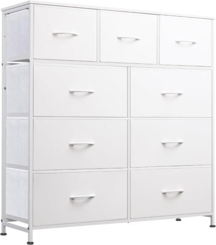 WLIVE 9-Drawer Dresser, Fabric Storage Tower for Bedroom, Hallway, Closet, Tall Chest Organizer Unit for Bedroom with Fabric Bins, Steel Frame, Wood Top, Easy Pull Handle, White