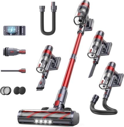 Cordless Vacuum Cleaner, 30Kpa Home Stick Vacuum, Smart Display & 1.5L Dust Cup, 55mins Max Runtime, Rechargeable Lightweight Handheld Vavuum for Pet Hair/Carpet/Hardwood Floor/Car (Red)
