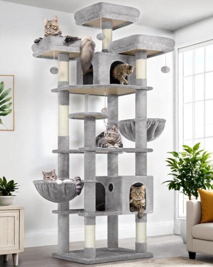Feandrea Cat Tree, 81.1-Inch Large Cat Tower with 13 Scratching Posts, 2 Perches, 2 Caves, Basket, Hammock, Pompoms, Multi-Level Plush Cat Condo for Indoor Cats, Smoky Gray UPCT190G01