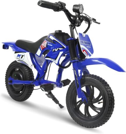 Kids Electric Motorcycle, 25.2V 300W Brushless Motor & Controller, 3 Speeds (10MPH, 8 Miles), LCD, LED, Moto Sound, Twist Grip, Dual Suspension & Brakes, for 3-8 yrs, 110 LB (Blue)