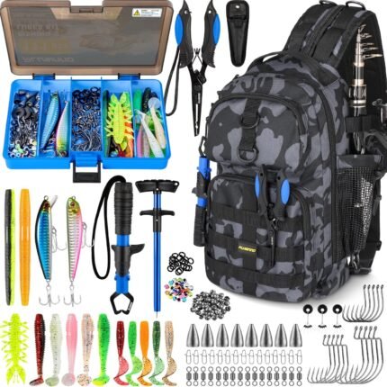 PLUSINNO Fishing Backpack with Tackle Boxes, Waterproof Fishing Sling Tackle Bag For Fishing Gear With Rod Holder, Fishing Gifts for Men With Fishing lures, Fishing pliers, Fish Lip Gripper.
