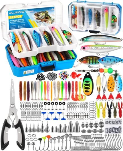 PLUSINNO Fishing Tackle Box with Tackle Included, 373PCS Fishing Lures Kit with Removable Tray, Fishing Gear with Pliers, Weights, Hooks, Accessories, Fishing Tackle Lure Kit Gifts for Men Bass Trout
