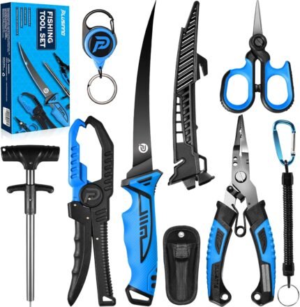 PLUSINNO Fishing Gear, Fishing Tools, 7PCS Fishing Accessories, Corrosion Resistant Fishing Pliers Kit, Fishing Knife, Floating Fish Lip Gripper Fishing Gifts for Men, Gifts for Fishermen