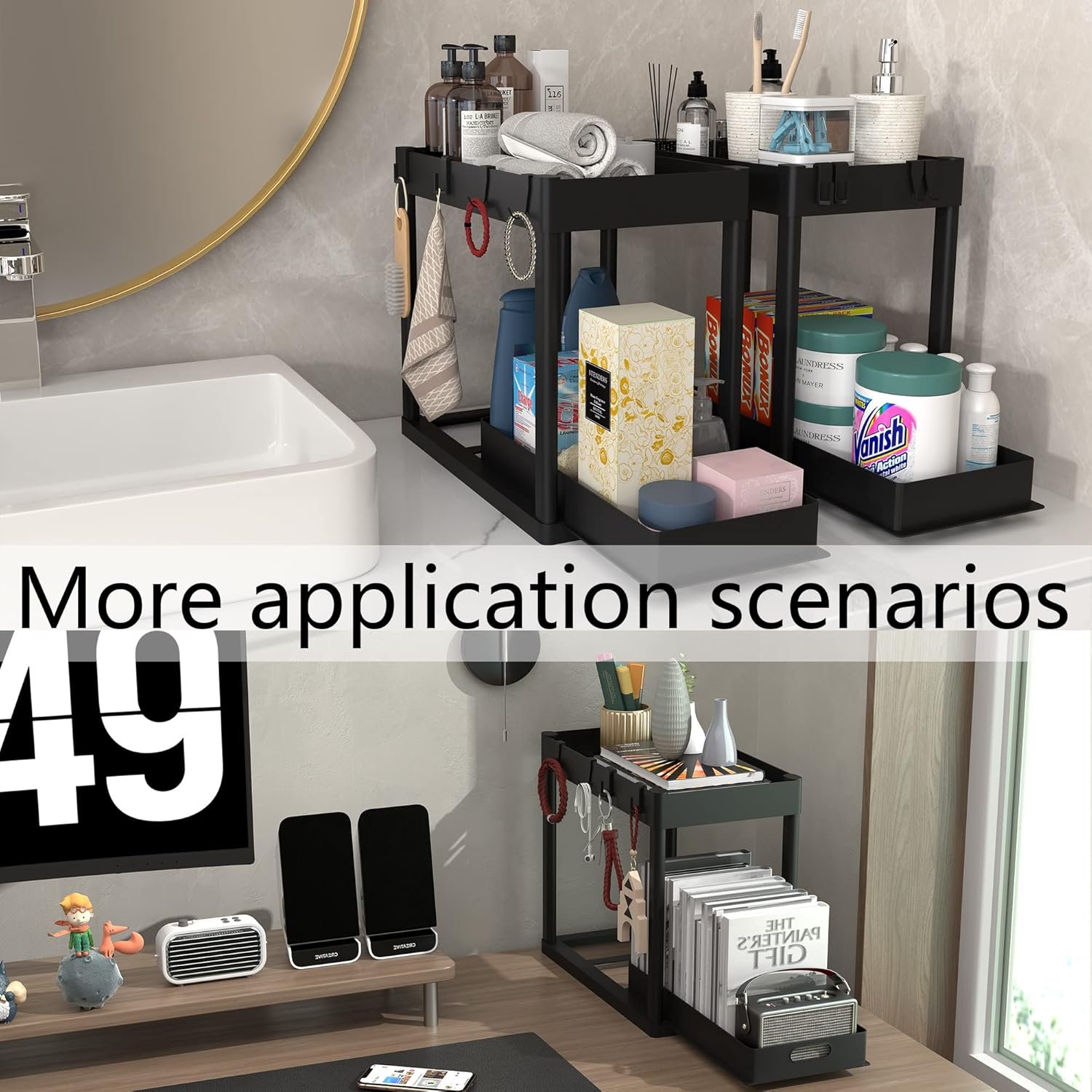 2 Pack Multi-Purpose Pull-Out Storage Organizers, Under Sink Organizers and Storage for Bathroom & Kitchen, Under Cabinet Organizers and storage, 12.8 Inch, Black