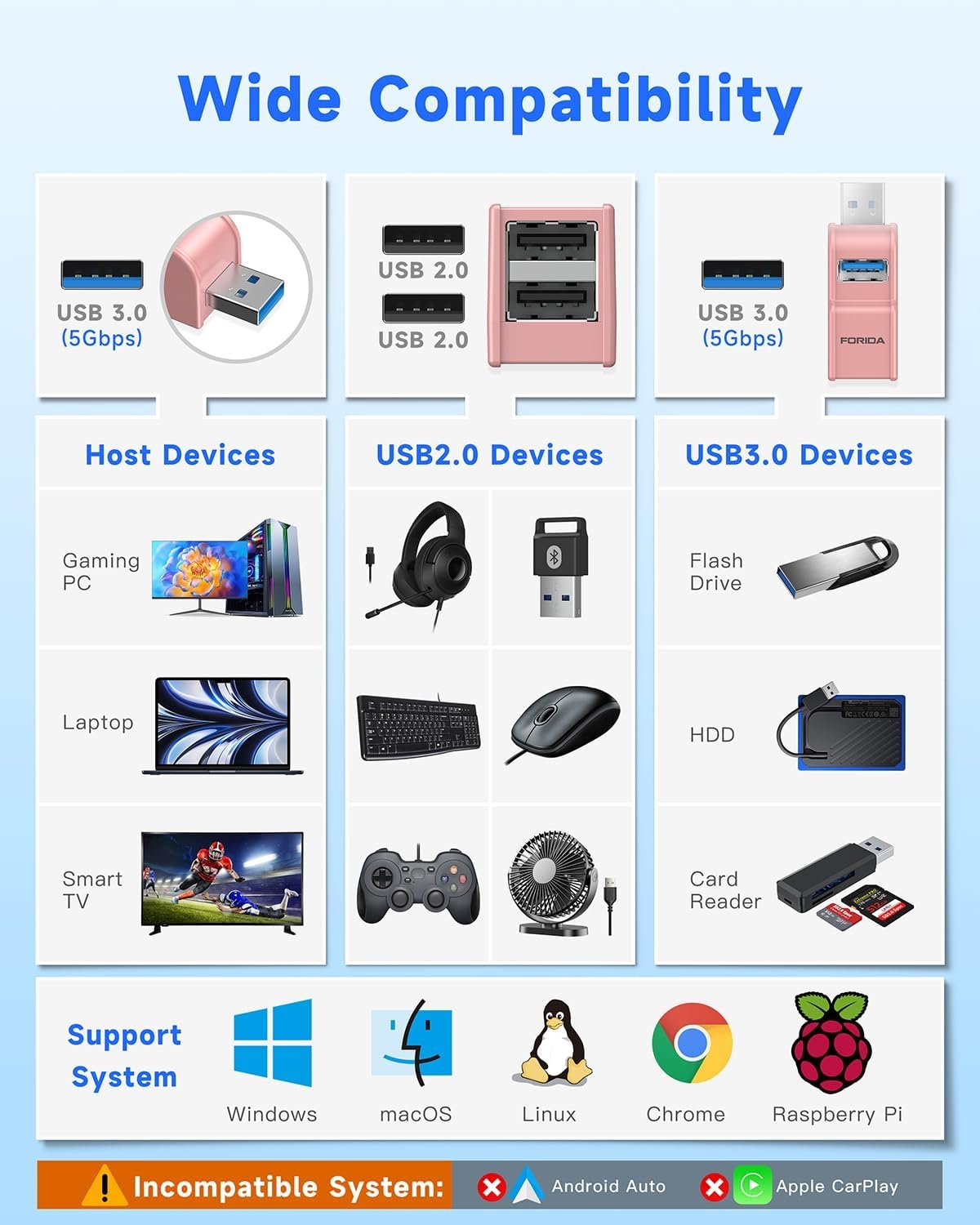 3 Ports USB 3.0 Adapter, USB Hub with 1 USB 3.0 and 2 USB 2.0 Port, Portable USB Port Splitter for Keyborad, Mobile Hard Disk, U Disk, Camera, Mouse,etc (Pink)