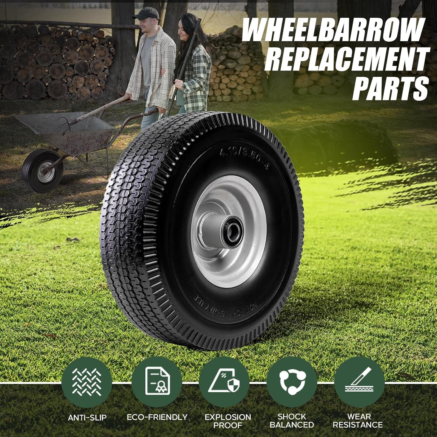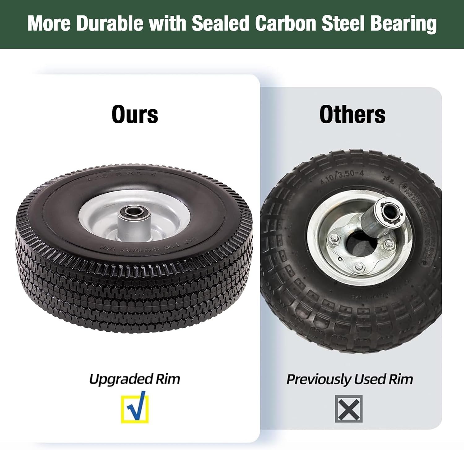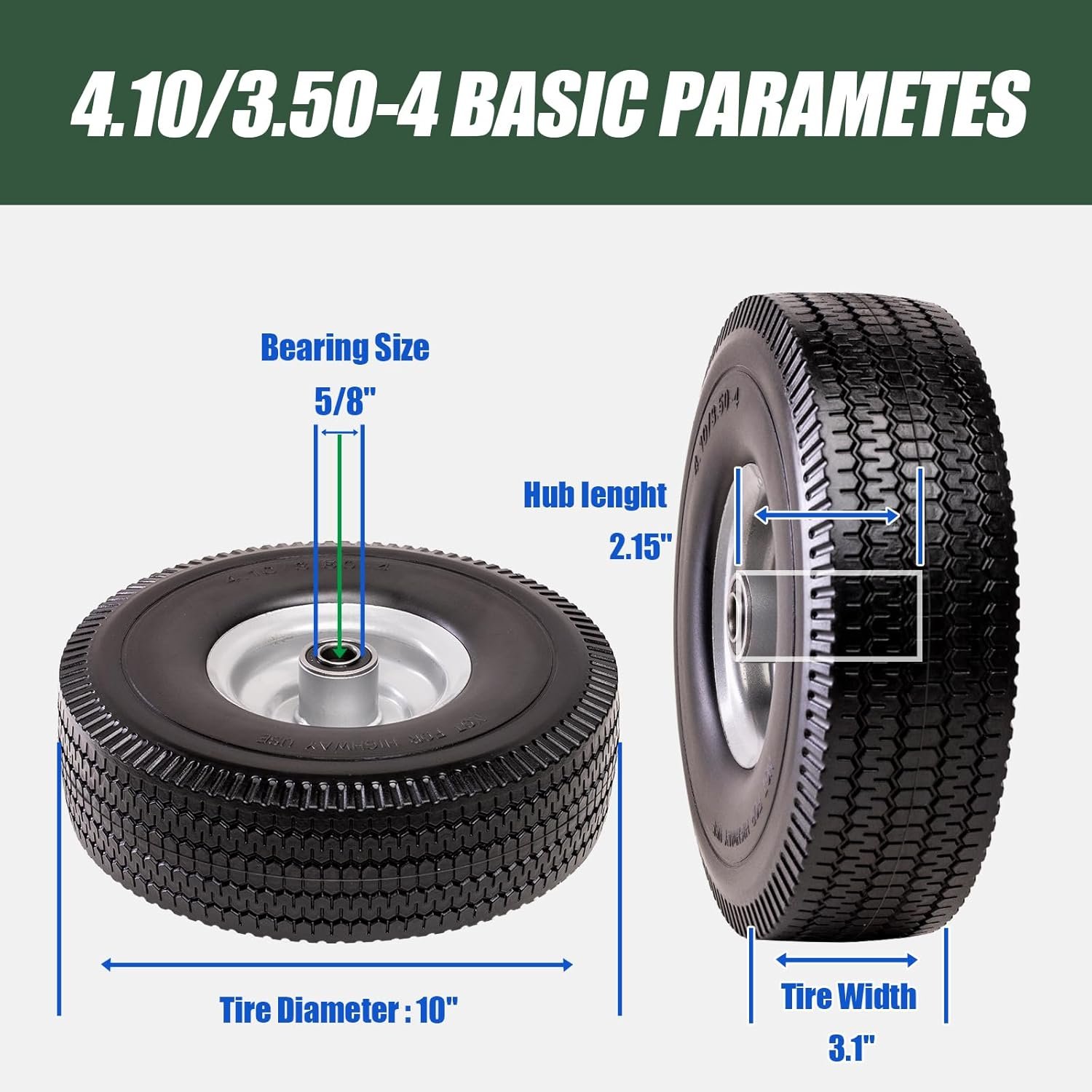4.10/3.50-4 Tire & Wheel Flat Free, 2 Pcs Heavy Duty Solid PU Non-inflated Tires with Double Sealed Bearings, 5/8 in Axle Bore Hole & 2.15 in Offset Hub for Dolly/Garden Cart/Wheelbarrow/Wagon