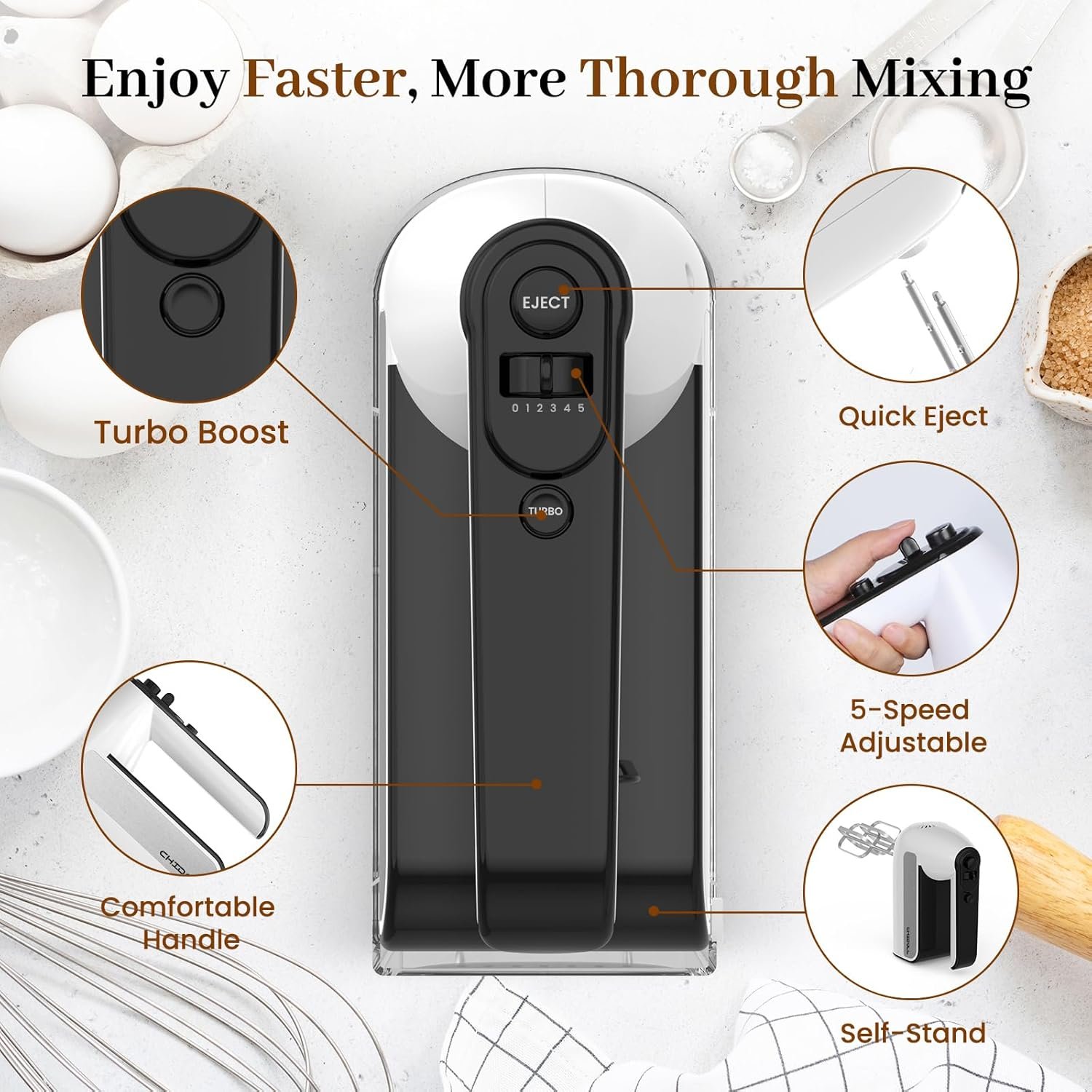 5-Speed Electric Hand Mixer, 800W Handheld Mixer with Turbo for Baking & Cooking, Kitchen Food Mixer with Storage Case & 5 Stainless Steel Attachments (2 Beaters, 2 Dough Hooks, 2 Whisks)-White