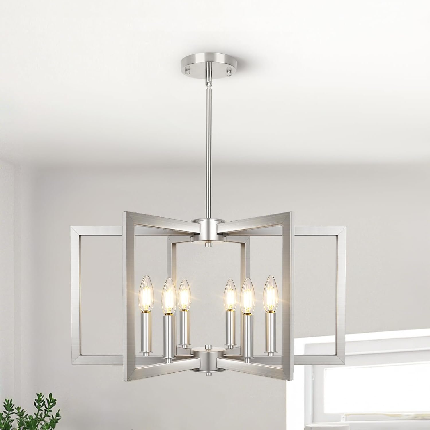 6-Light Brushed Nickel Chandelier, Farmhouse Dining Room Light Fixture, Modern Chandelier, Geometric Industrial Metal Hang Lighting Fixture for Foyer Entryway Kitchen Over Table Hallway Living Room