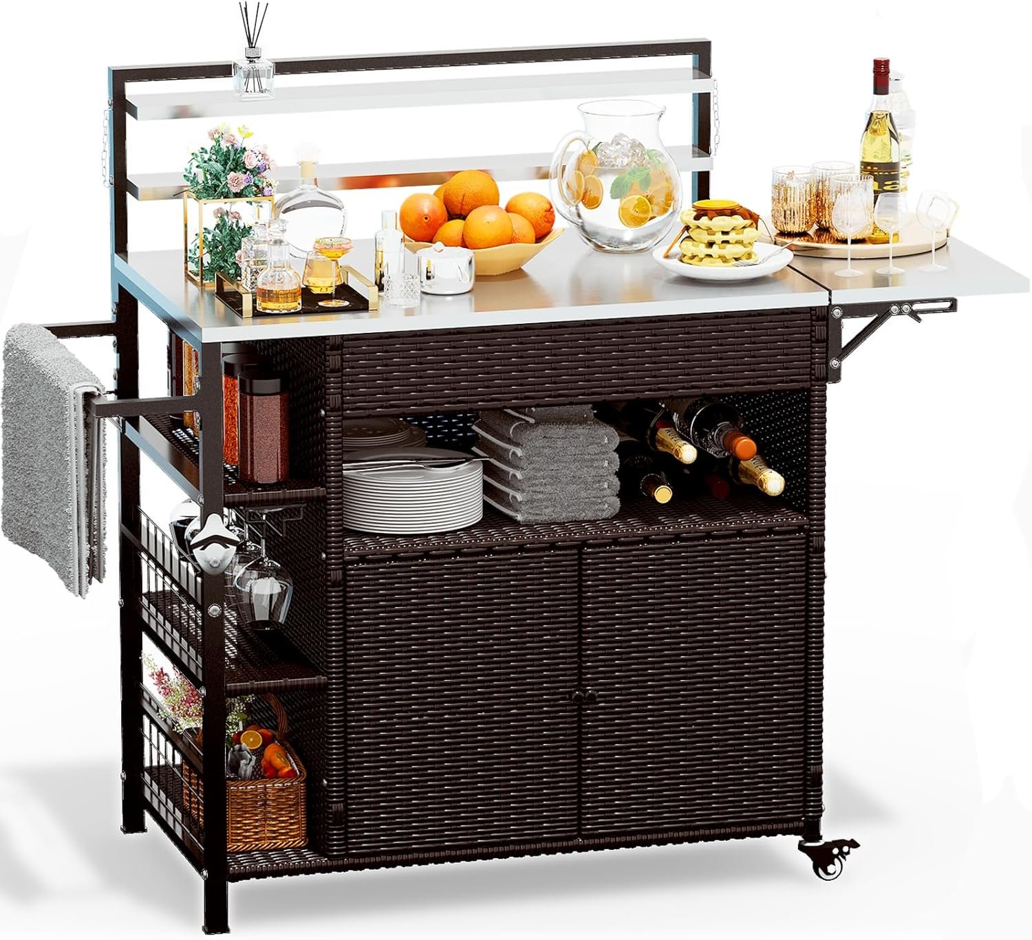 60” Outdoor Grill Cart with Storage, Patio Kitchen Island on Wheels&Spice Rack, Wicker Outdoor Grill Cart with Extended Stainless Steel Table Top Outdoor for Home Party Outside BBQ Bar