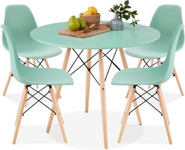 Best Choice Products 5-Piece Dining Set, Compact Mid-Century Modern Table & Chair Set for Home, Apartment w/ 4 Chairs, Plastic Seats, Wooden Legs, Metal Frame – Light Green/Oak