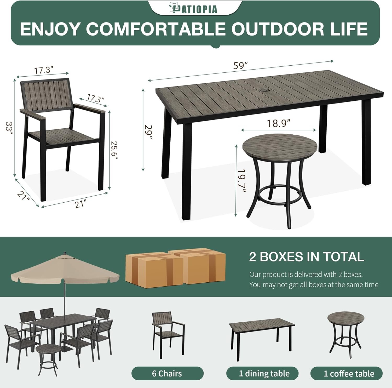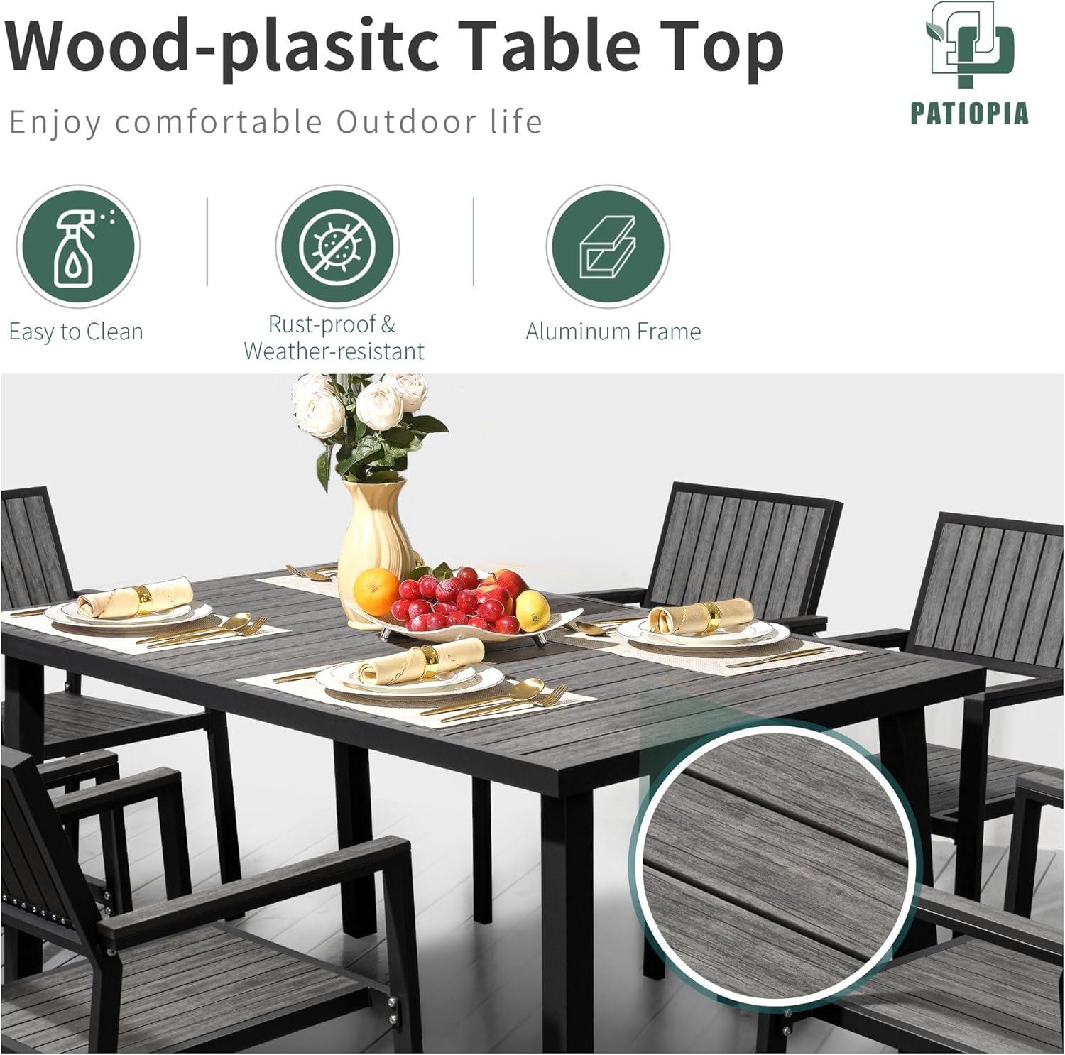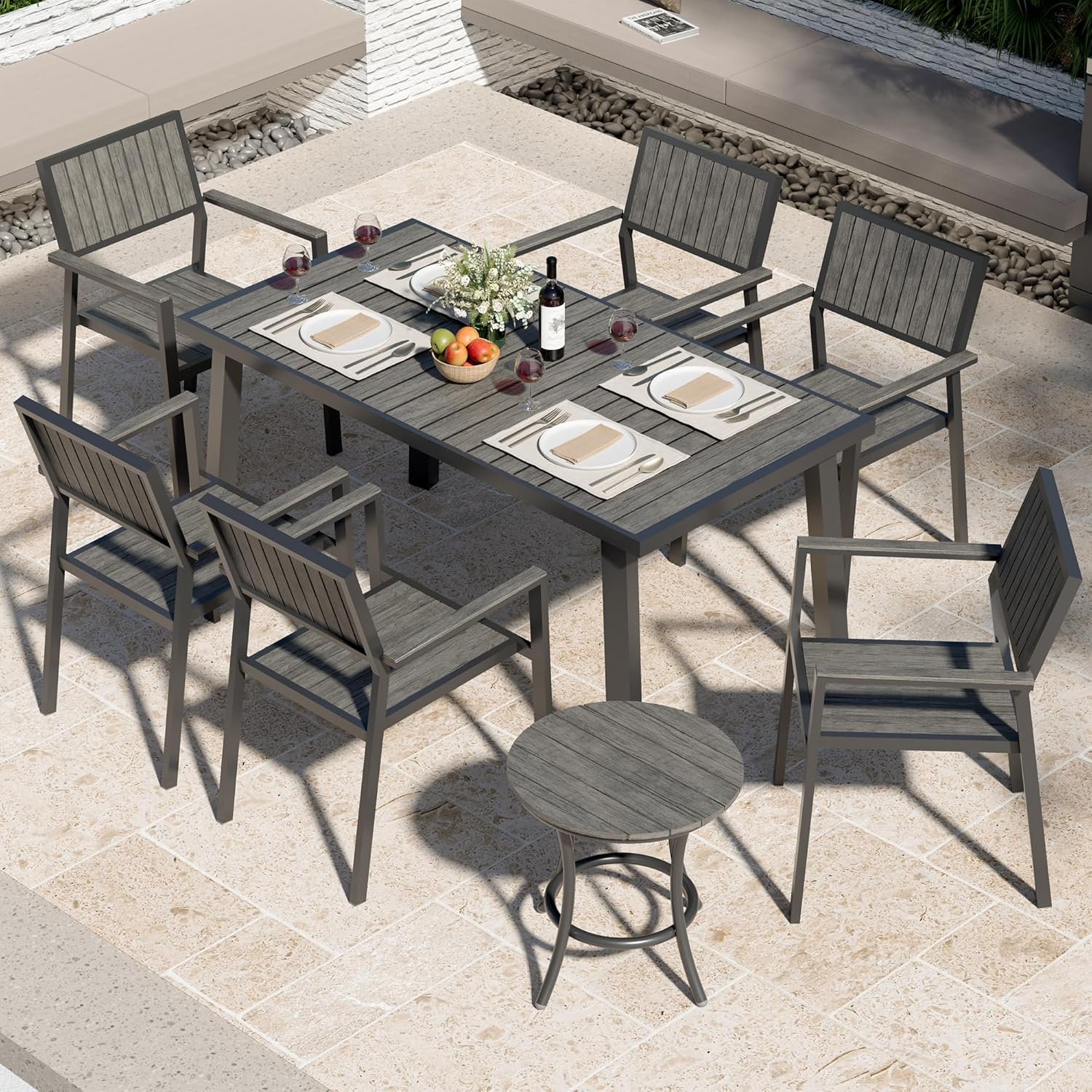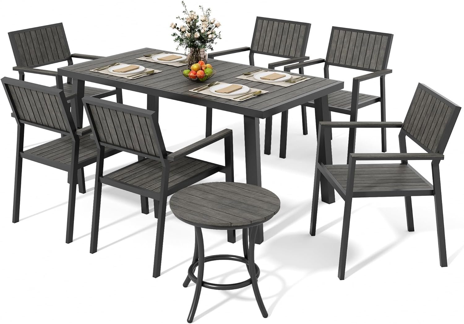 8-Piece Patio Dining Set,Aluminum Outdoor Furniture Set with Wood Table Top,Patio Table and Chairs Set with 6 Outdoor Stackable Chairs for Patio Garden Poolside,Ink