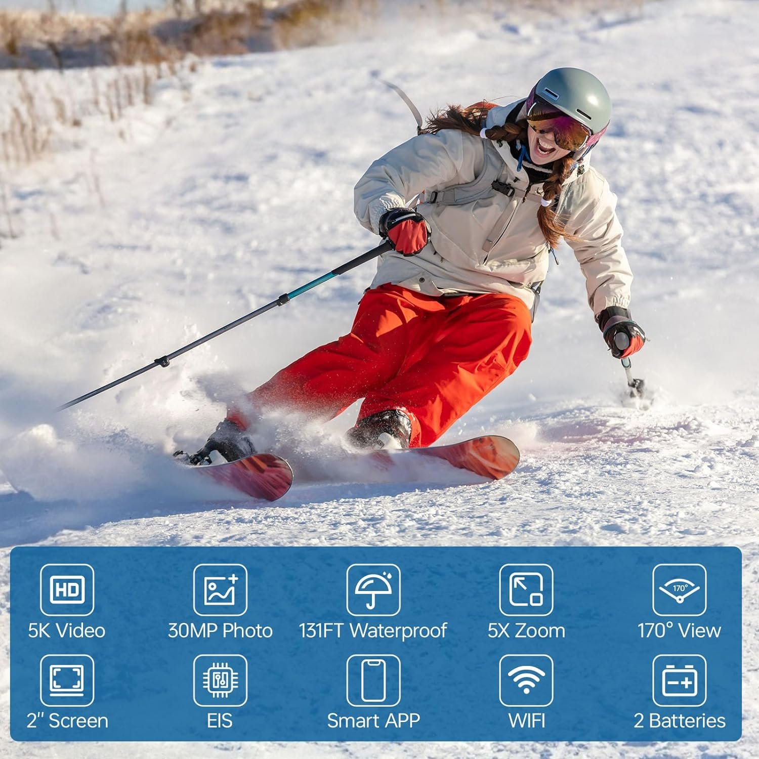 Action Camera 5K 30FPS Waterproof Camera Underwater 131FT with EIS WiFi App Remote Control 64GB Card 170° Wide Angle Sports Helmet Bike Video Black with 64GB Card