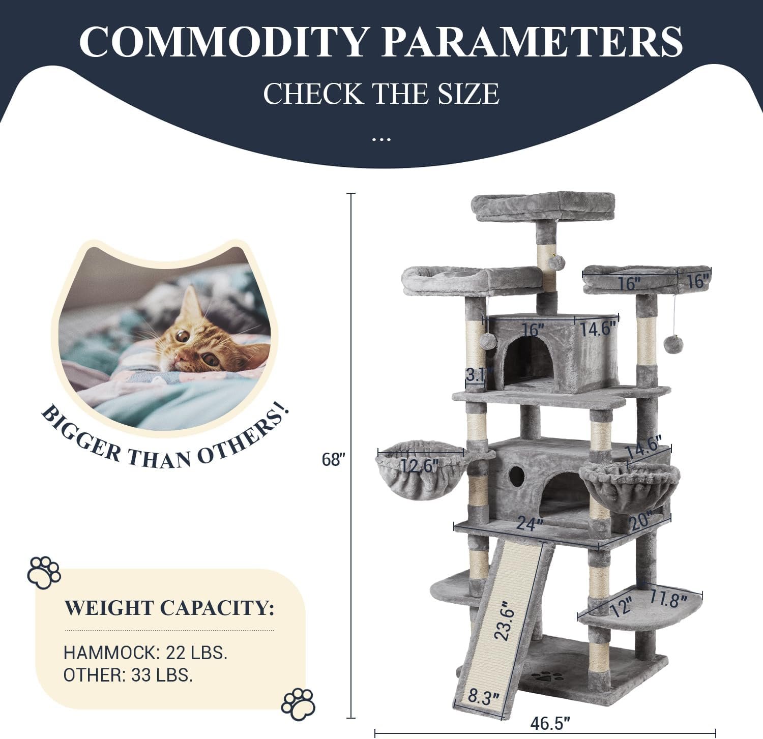 Allewie 68 Inches Cat Tree/House and Towers for Big Feline/Scratching Post/Multi-Level Large Kitty Climbing Tree with Condo/Light Grey