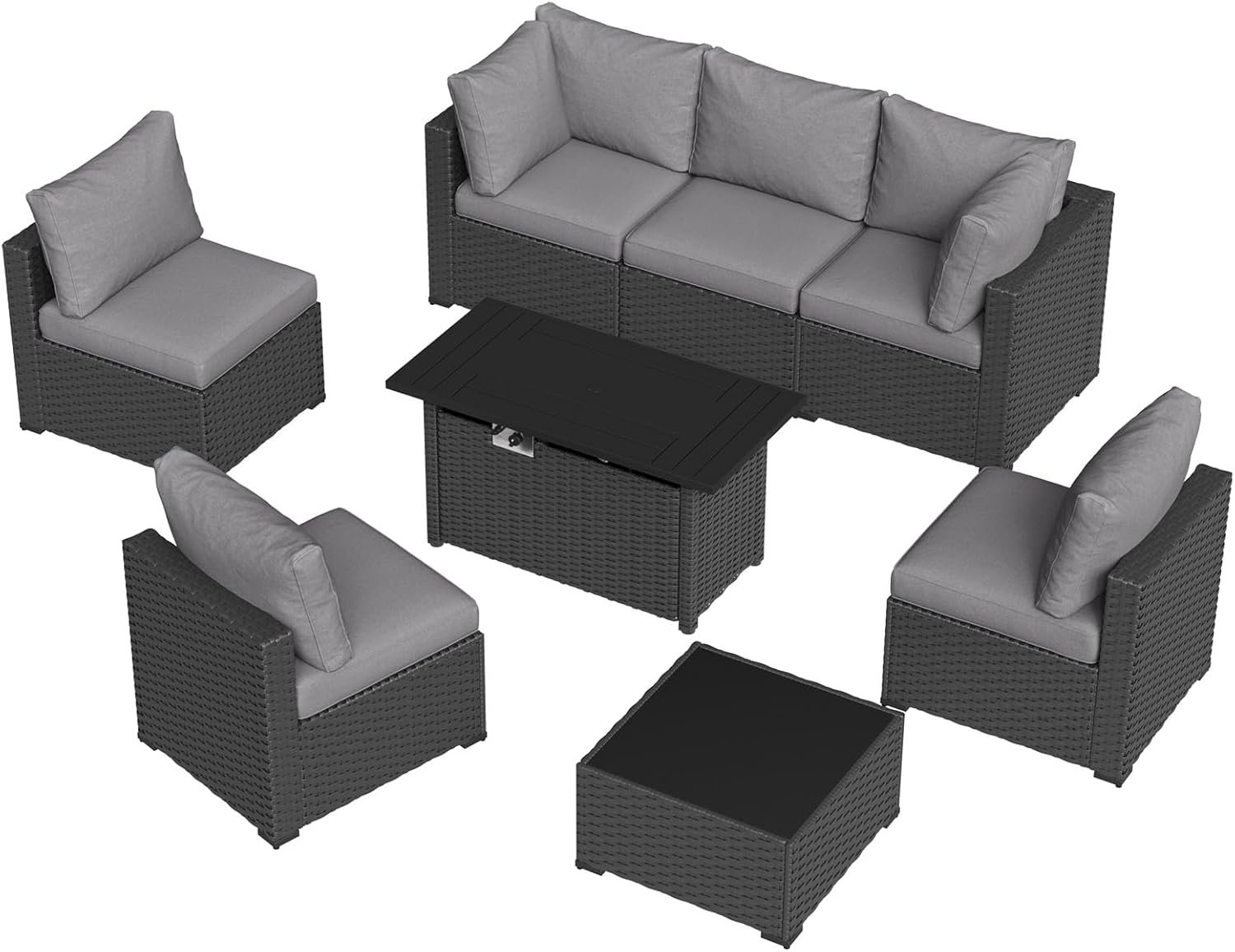 Aoxun 8 Piece Patio Furniture Set with 44” Fire Pit Table Wicker Rattan Patio Sectional Sofa Set Outdoor Seating Furniture with Thickened Cushion, Grey