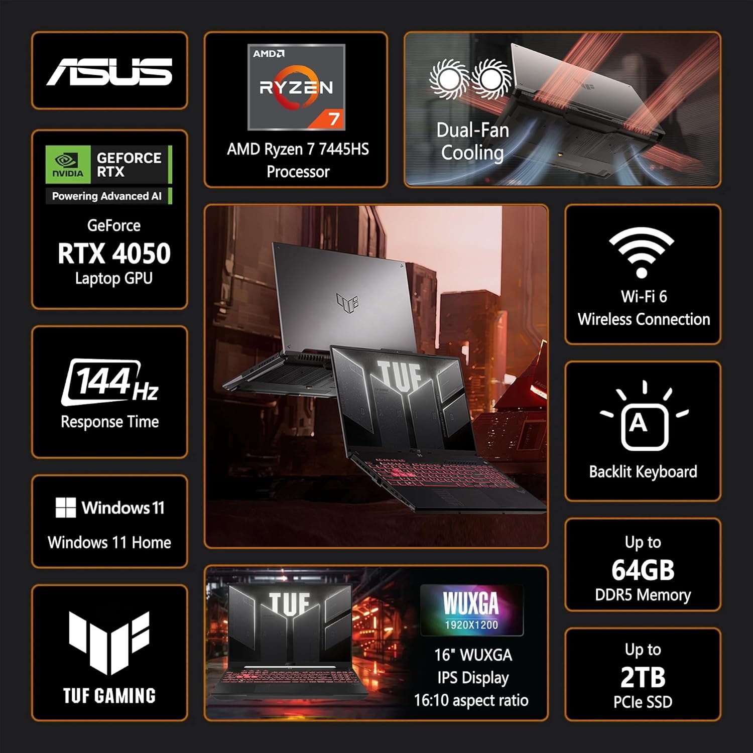 ASUS TUF A16 Gaming Laptop | 16″ WUXGA IPS 144Hz | AMD 6-Core Ryzen 7 7445HS | 16GB DDR5 512GB SSD | NVIDIA GeForce RTX 4050 (194 AI Tops) | Backlit Keyboard USB 4 Wi-Fi 6 Win11 w/DLCA Accessory