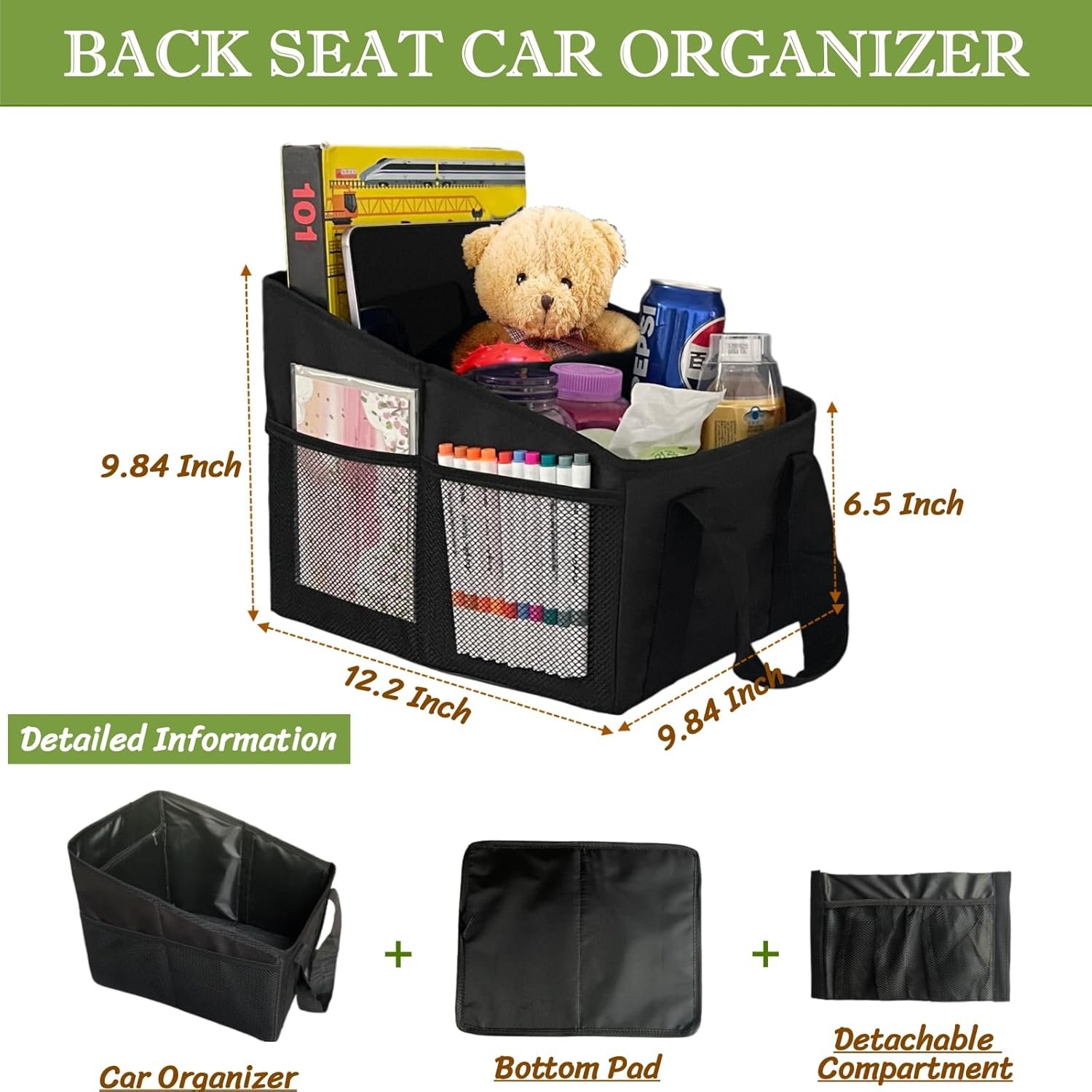 Upgrade Car Seat Organizer Backseat with Storage Pockets, Multipurpose Car Organizer Hanging, Car Trash Bag Can,Premium PU Leather Garbage Can 2.14 Gallon Large Capacity, Black.