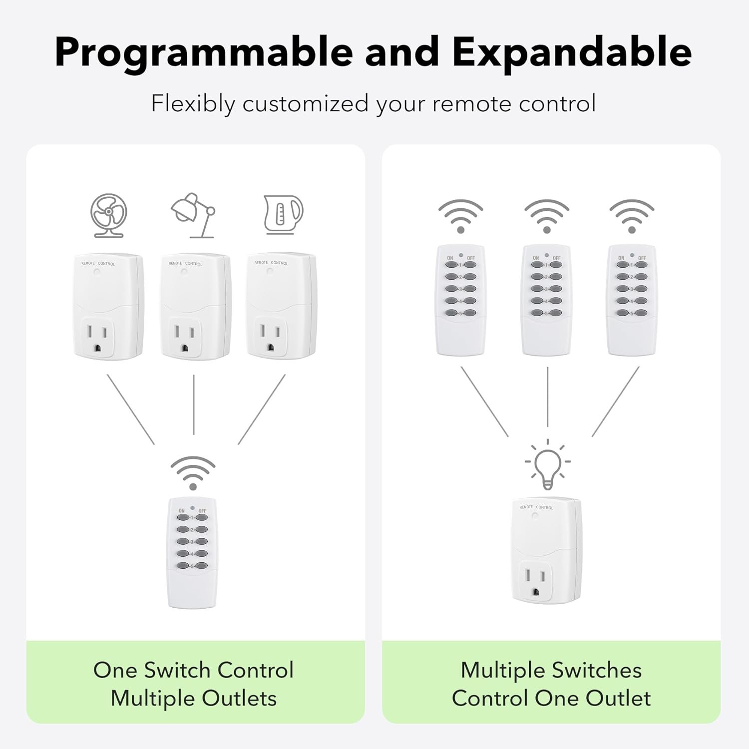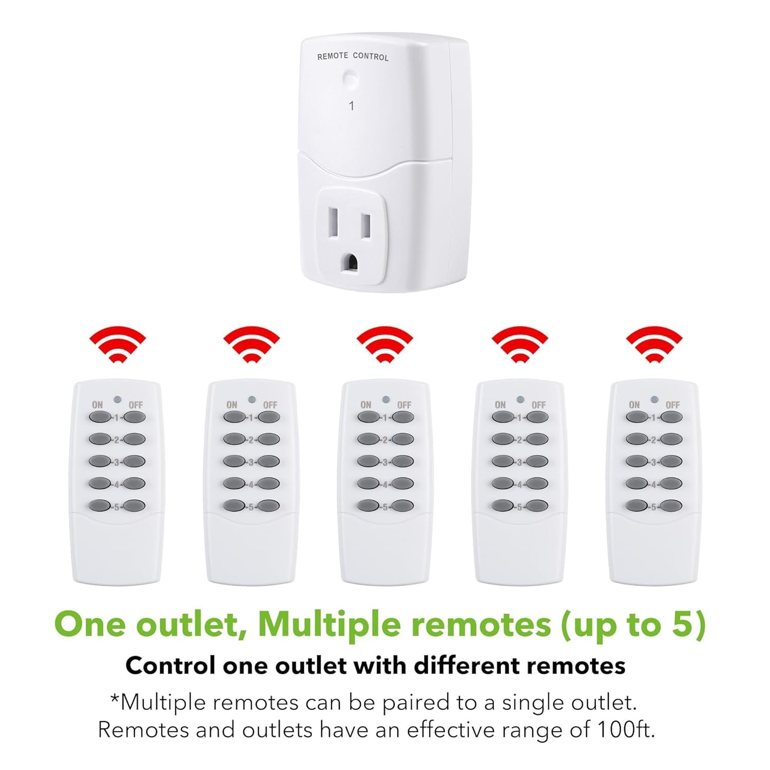 BN-LINK Mini Wireless Remote Control Outlet Switch Power Plug in for Household Appliances, Wireless Remote Light Switch, LED Light Bulbs, White (2 Remotes + 5 Outlets) 1250W/10A