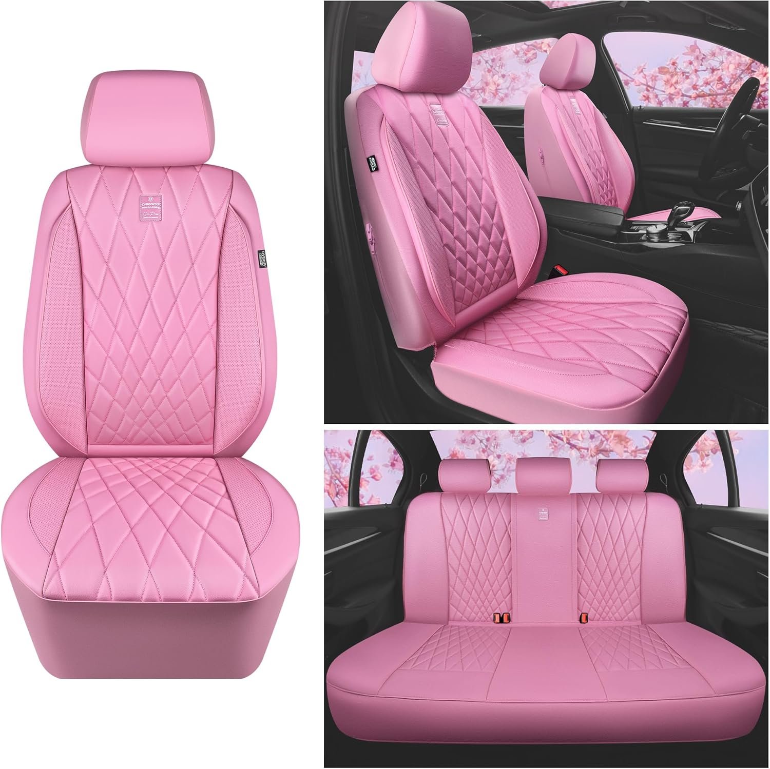 CAR PASS 5 Seats Piping Luxury Leather Seat Covers Full Set, Anti-Slip Waterproof Seat Covers Compatible with Front Armrests, Universal Fit for Suvs,Vans,Trucks,Airbag Compatible, Pure Pink