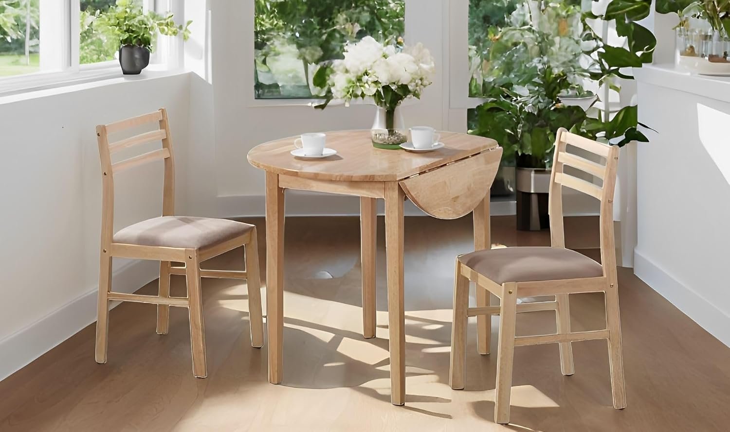 CARTESIAN 3-Piece Drop Leaf Dining Set, Natural Wood Table and 2 Chairs with Beige Cushions, Small Space Kitchen Furniture
