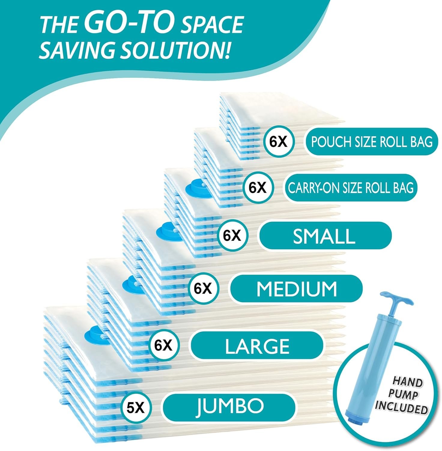 Cozy Essential 35 Pack Vacuum Storage Bags, Space Saver Bags (5 Jumbo/6 Large/6 Medium/6 Small/6 Roll-M/6 Roll-S) Compression for Comforters and Blankets, Pillow, Bedding, Sealer Clothes Storage