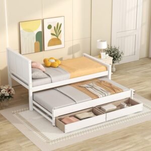 Merax Classic Solid Wooden Bed Farme with Trundle Bed and Drawers Storage Sofa Bed for Living Room Bedroom Guest Room Space Saving,White