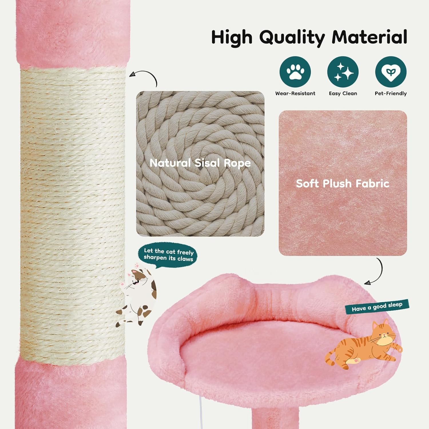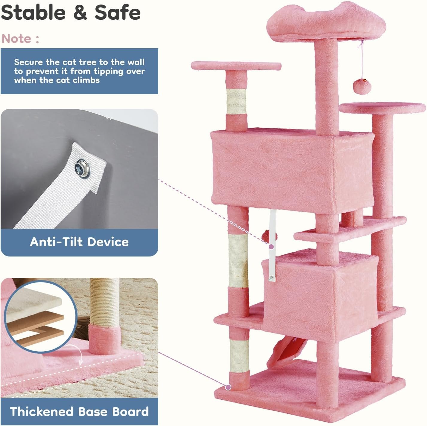 DUMOS 54-inch Indoor Cat Tree Tower –Multi-Level Pet House for Large Cats with 2 Condos, Scratching Posts, Round Platform, Small Ladder, and Toys, Pink
