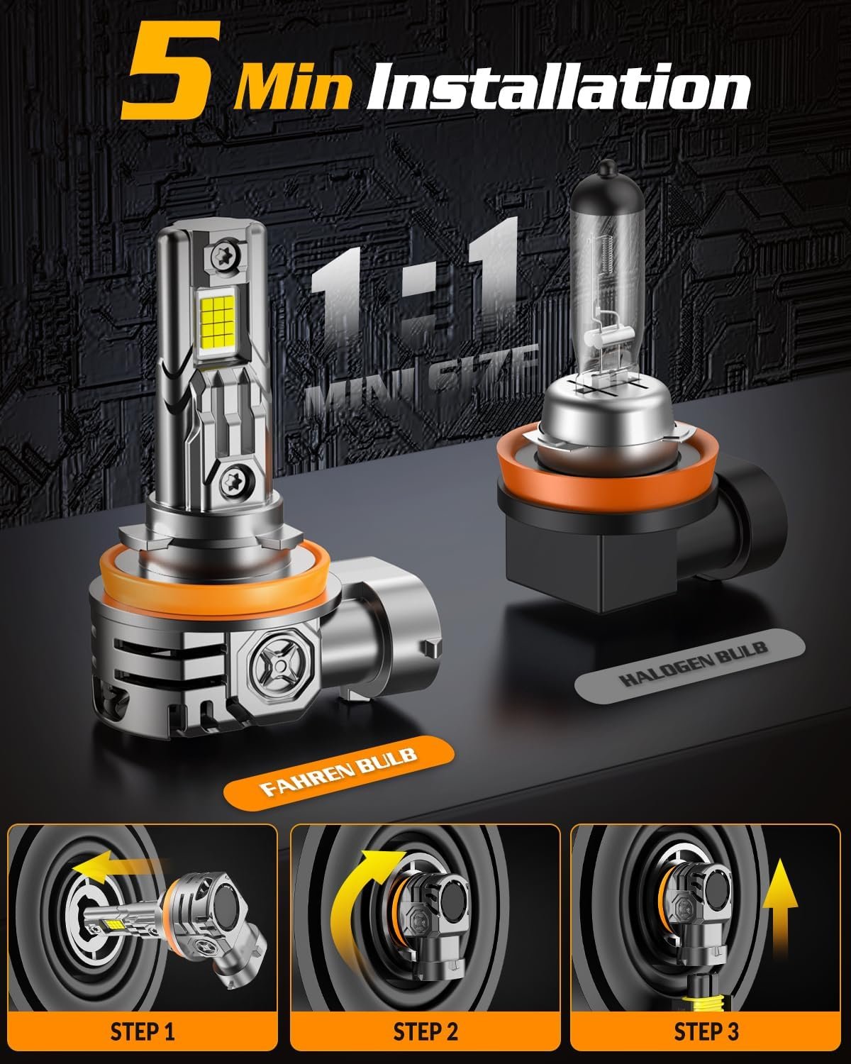FAHREN H11/H8/H9 LED Light Bulbs, 60,000LM 1100% Ultra Brightness, 6500K H9 Fog Bulbs, 10-Year Lifespan with Cooling Fan, 1:1 Size Easy Installation,99% Universal Fit Plug and Play, Pack of 2