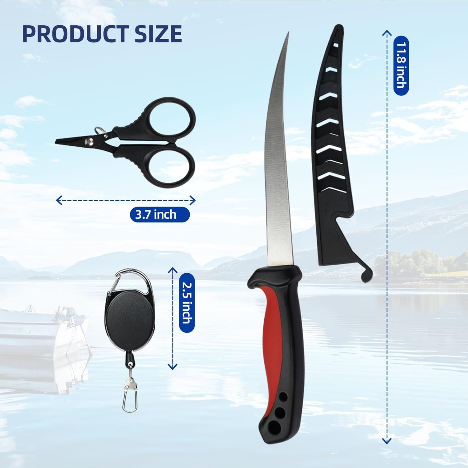 Fishing Kit,Filleting Knife,Hook Remover,Fish Grip, Line Cutter,Fishing Scale, Pliers with Lanyards,Not Include Batteries
