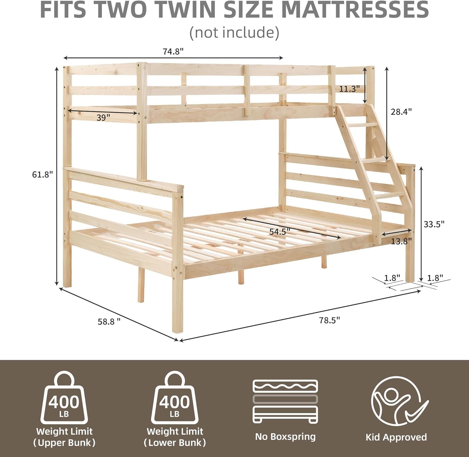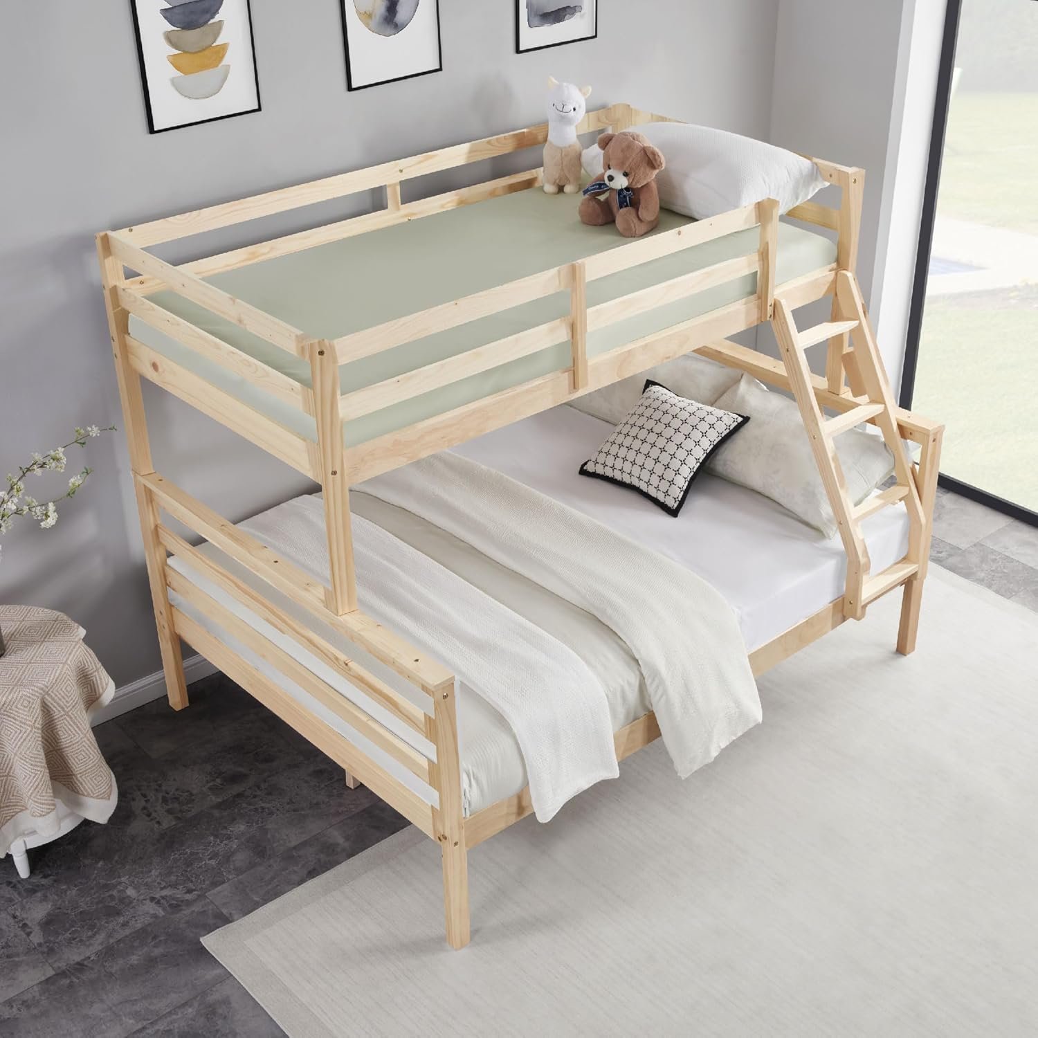FLEXISPOT Twin Over Full Bunk Bed with Ladder,Wooden Bunk Bed with High Guardrail and Ladder for Kids, Teens, Dorm Rooms, and Guest Rooms,No Box Spring Needed,Natural