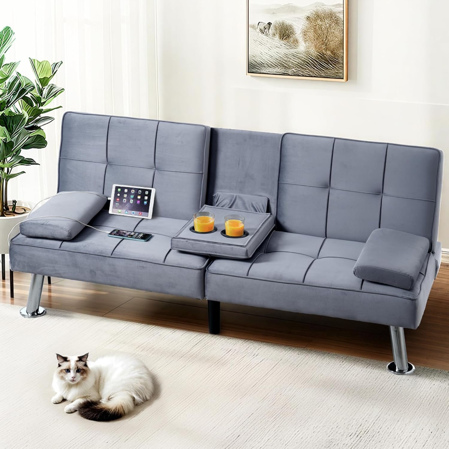 FLEXISPOT XCT3 Futon Sofa Bed with USB & Type-C Charging Port, Convertible Sleeper Couch with Adjustable Backrest, Folding Loveseat for Small Space, Living Room, Guest Room, Apartment (Velvet, Gray)