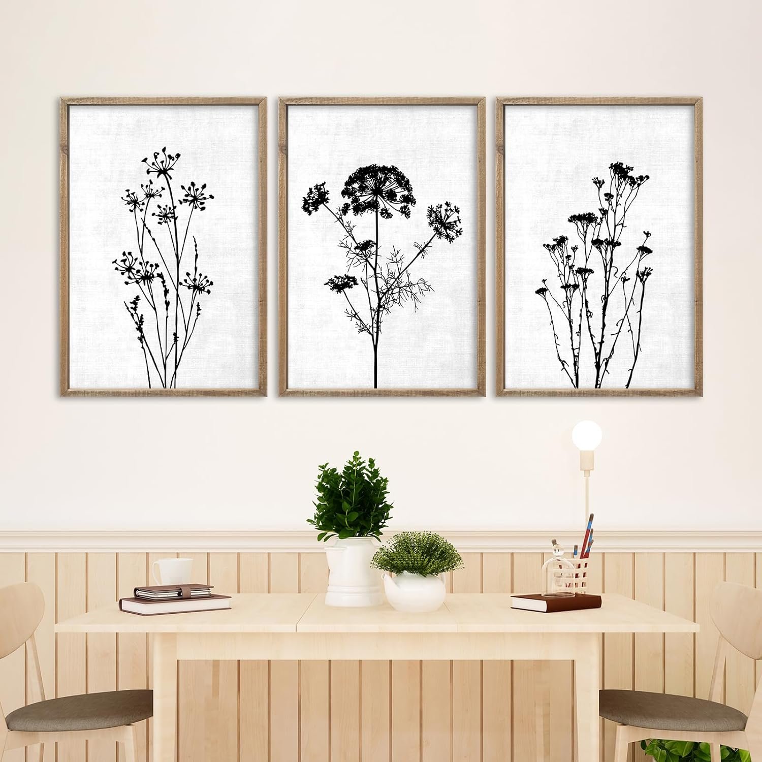Flower Plant Wall Art Decor 16″x11″ Set of 3 Black And White Botanical Painting Wood Framed For Minimalist Bedroom Office Rustic Living Room Abstract Wildflower Sign Hanging (Wood White)