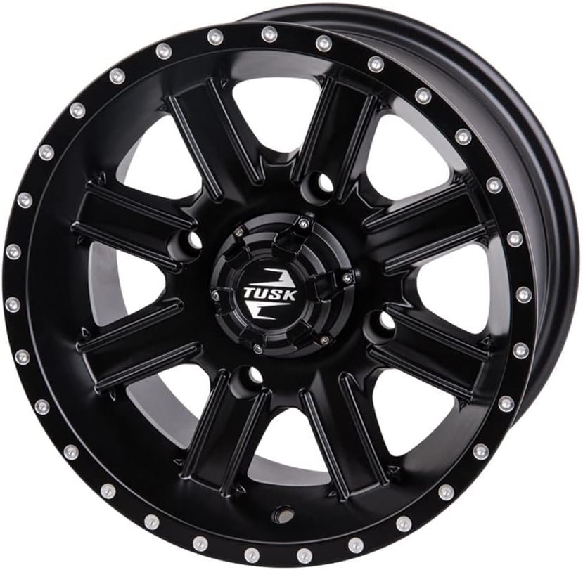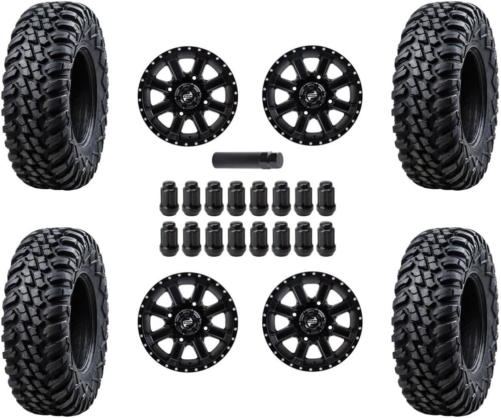 Four 28×10-14 Tusk TERRABITE 8-Ply Radial UTV Tires mounted on Tusk CASCADE Wheels – For POLARIS applications – 4/156 bolt pattern – Includes Lug Nuts (4+3 Wheel Offset, Matte Black)