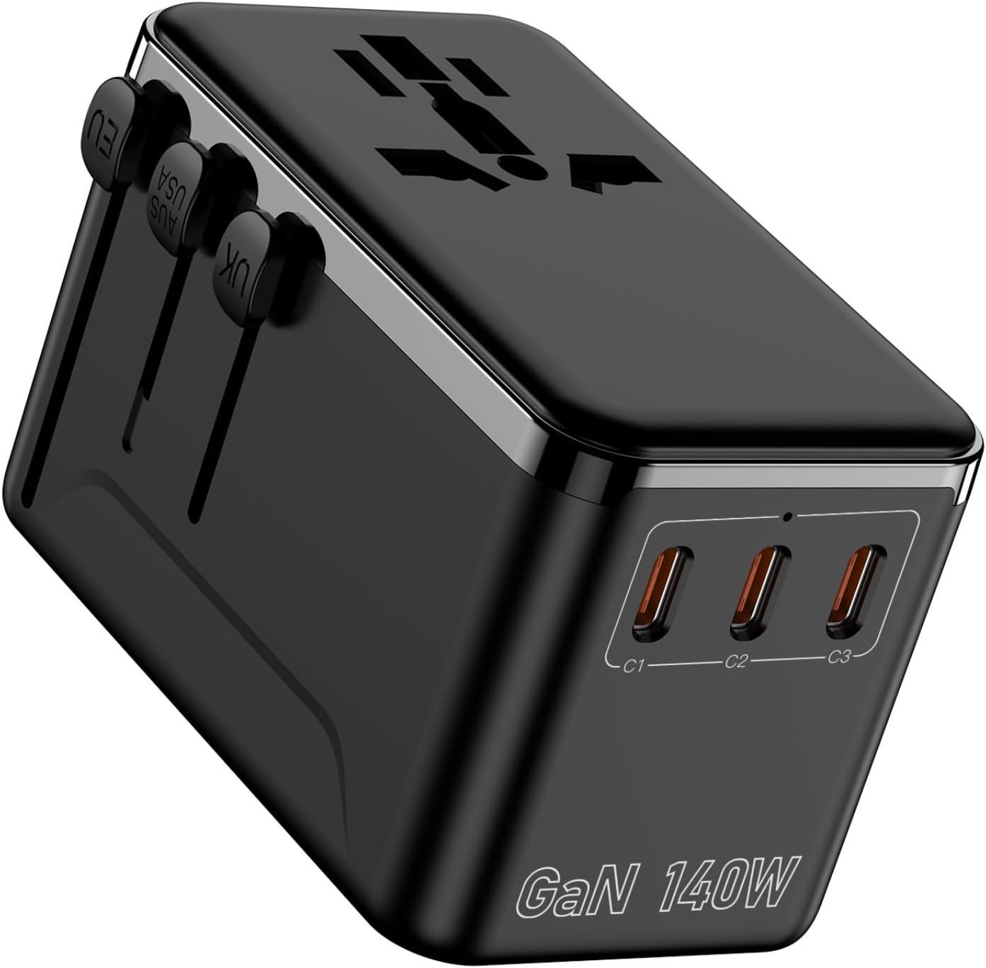 GaN 140W Fast Charging Travel Adapter, Global Plug Converter for UK/EU/US/AU, 3 USB-C + 1 USB-A Multi-Port Universal Charger with Smart Power Distribution & Safety Protection