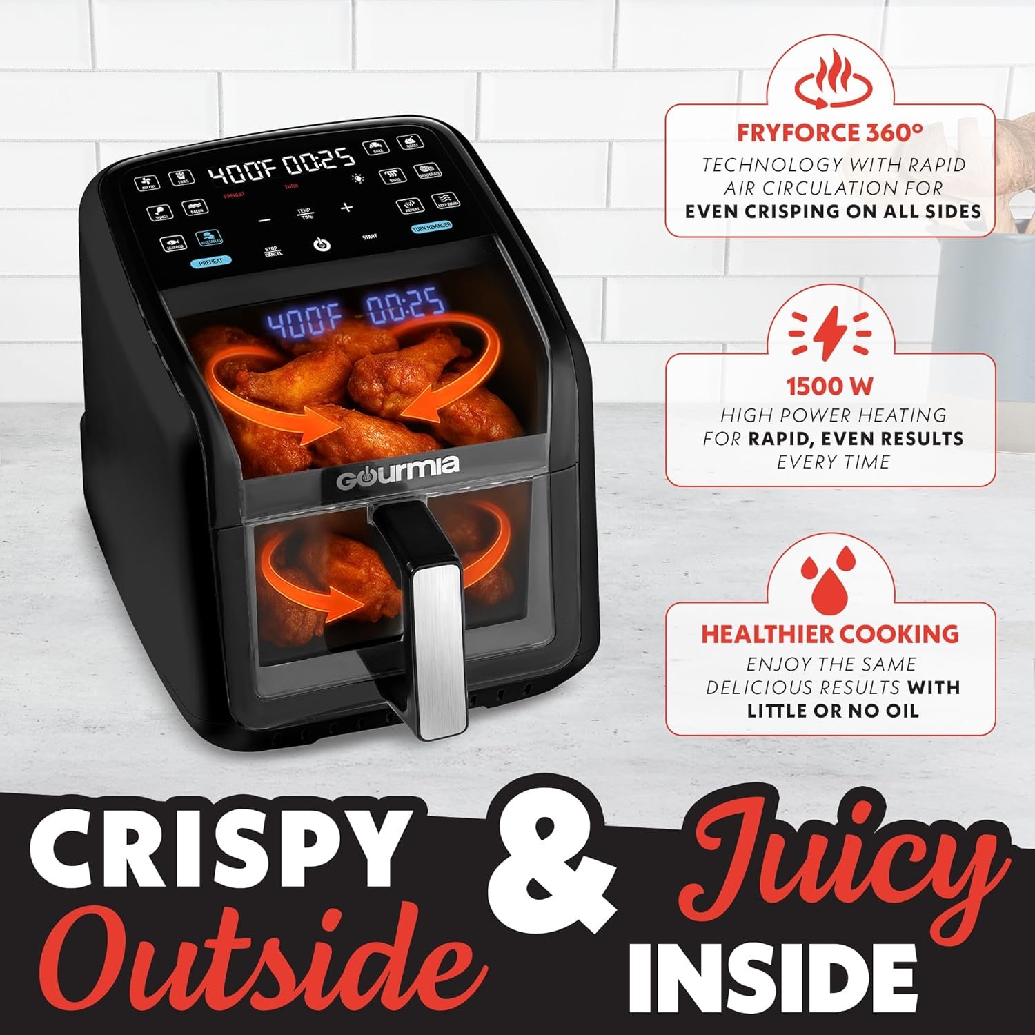 Gourmia Air Fryer 7 QT – Easy View Panoramic Window & Interior Light, Guided Cooking with 12 One-Touch Presets, FryForce 360, Dishwasher Safe Accessories, Black