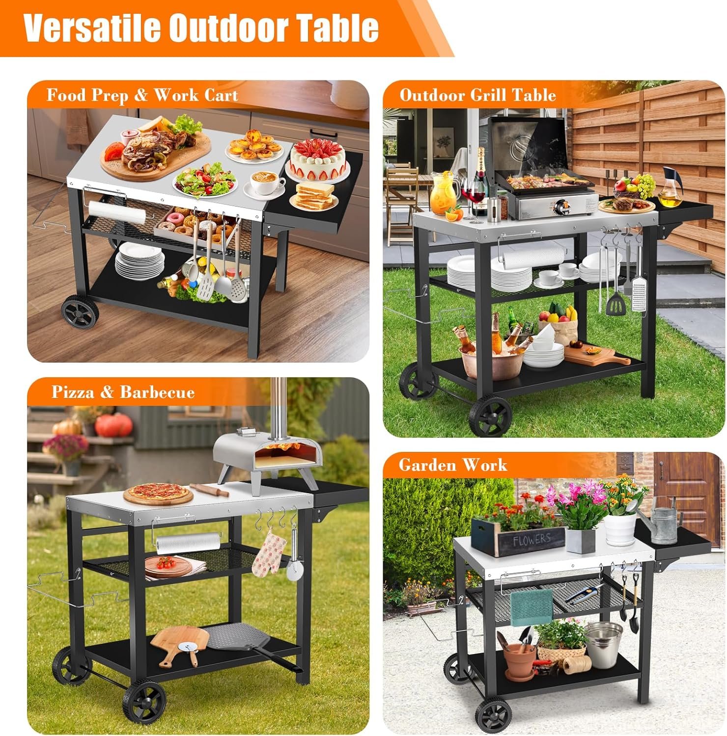 3-Shelf Outdoor Grill Table,Pizza Oven Table for Outside,Movable Grill Cart with Wheels,Indoor & Outdoor Cooking Station, Pizza Oven Stand for Ooni Blackstone Griddle 33.5”x 21.7”