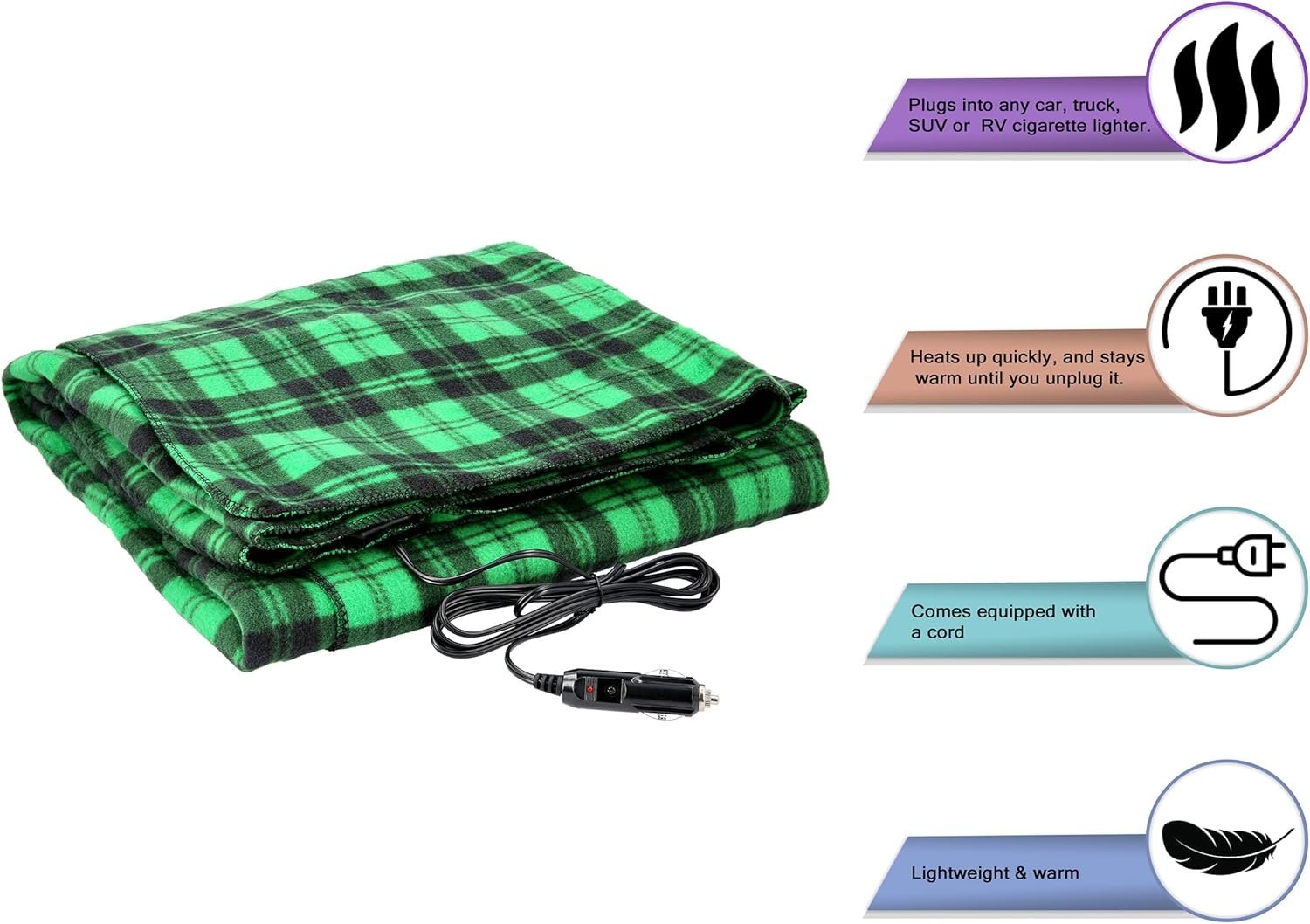 Heated Blanket – 12-Volt Electric Blanket for Car, Truck, SUV, or RV – Portable Winter Car Accessories for Camping or Travel by Stalwart (Green Plaid)