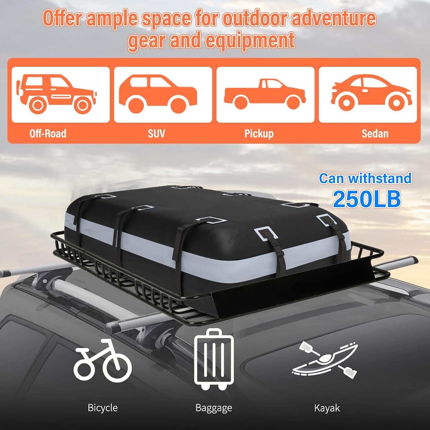 Heavy Duty Universal Rooftop Cargo Carrier Roof Rack, 64″x36″x5″ Roof Rack Basket with 20 Cu.Ft Waterproof Bag, for SUV, Truck and Van, 250lbs Capacity, Corrosion Resistant (ROOF 64″ and Bag)